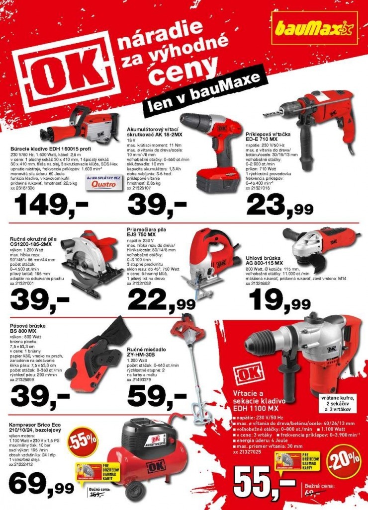 Kromě akčního letáku Baumax si zde můžete prohlédnout i letáky dalších prodejců zboží pro dům, byt a zahradu: Bauhaus, Dom farieb, Hornbach, Merkury Market, Obi, Proma