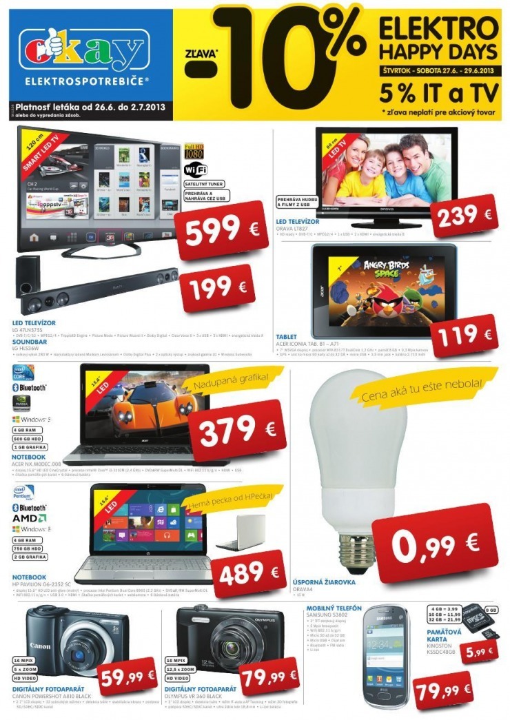Kromě akčního letáku Okay si zde můžete prohlédnout i letáky dalších prodejců elektra: Alza.sk, Datart, Electroworld, Euronics, Expert Elektro, NAY Elektrodom, playklub, ProELEKTRO, SHARK Computers